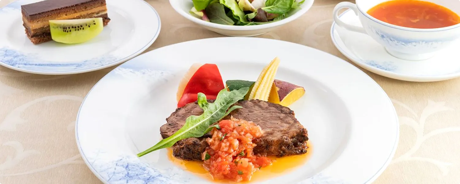 好評のイベリコ豚のグリエのセットや伝統の黄金カレーなどホテルが自慢のメニューをお楽しみいただけます。